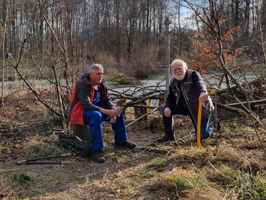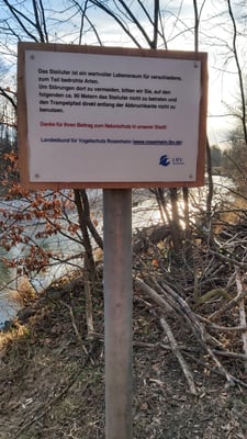 Das Steilufer an der Mangfall im Bereich Aisingerwies/Oberwöhr ist ökologisch ein wertvoller Lebensraum. Die Eisvögel haben dort bereits eine neue Niströhre gegraben, andere Vogelarten nutzen das Steilufer für die Suche nach Insekten, aber auch als Brutplatz und das Totholz am Fuß des Steilufers zum Rasten. Damit Störungen dort so gering wie möglich sind, haben 5 Mitglieder der KG und zwei „Nicht-LBVler“ im März in einem anstrengenden Arbeitseinsatz den „wilden“ Trampelpfad an der Abbruchkante nochmal mit zusätzlichem Totholz verbaut. Schon einige Tage vorher wurden in dem Bereich vier neue Infotafeln angebracht, die dort vor einigen Monaten verschwunden waren.