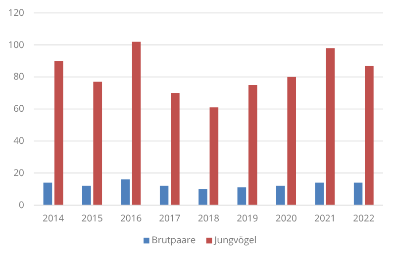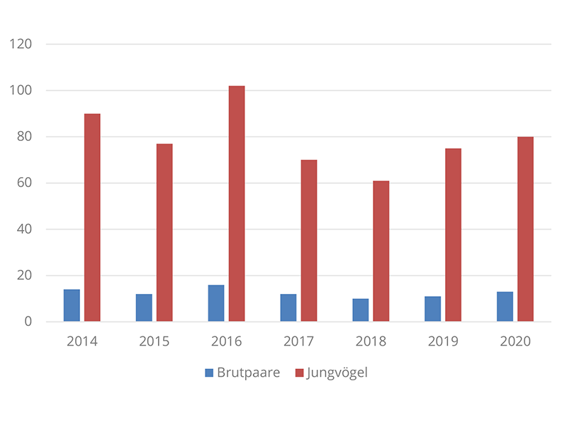 Die Zahl der Brutpaare ist mit 13 Brutpaaren sogar etwas höher als in den letzten Jahren. Mit 80 Jungvögeln lagen wir 2020 annähernd am Mittelwert der letzten Jahre.