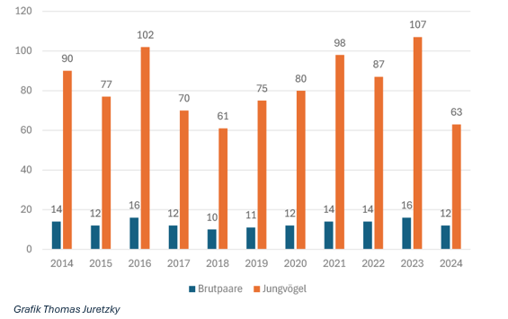 2015 wurden 77 Jungvögel aufgezogen (im Vergleich: 2014 waren es 90).